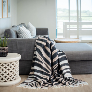 R899.00R799.00Make a bold yet elegant statement with our Zebra Skin Inspired Throw Blanket. Showcasing the iconic zebra stripe pattern in timeless black, soft ivory and warm taupe tones, this throw adds instant character and contemporary African luxury to your living space. Beautifully draped over a sofa, bed or reading chair, it effortlessly blends modern styling with natural texture. Crafted for both comfort and visual impact, this throw is soft, warm and finished with delicate fringed edges – perfect for cozy evenings or as a striking décor accent. Zebra Symbolism in African Culture In African culture, the zebra symbolises balance, unity and individuality. With its unique black and white stripes, the zebra represents the harmony between opposites, strength in diversity, and the power of standing out while remaining connected to the community. This makes the zebra-inspired design not just decorative, but deeply meaningful. Dimensions: 140cm x 180cm Composition: 100% super soft acrylic, triple jaquard weave, open selvedge Wash Care Instructions: Cold wash Do not bleach Do not iron Do not dry clean Do not tumble dry Keep away from fireAdd to cart -